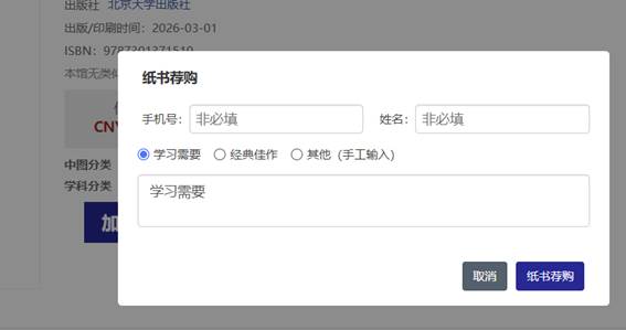4.页面将跳出如下窗口,选择荐购理由后,点击【纸书荐购】按钮。