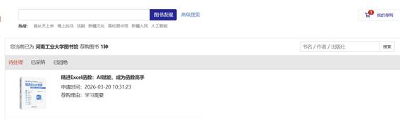 8.在主页面点击右上角“河南工业大学图书馆”可随时查看到目前已荐购的所有书目。